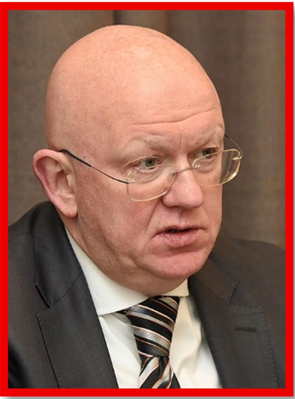 [6] O Βασίλι Νεμπένζια [1962 (Vasily Nebenzya)] υπηρετεί από τον Ιούλιο του 2017 στη θέση του Μόνιμου Αντιπρόσωπου της Ρωσίας στα Ηνωμένα Έθνη, Το διάστημα από 2013 έως το 2017 διετέλεσε Αναπληρωτής Υπουργός Εξωτερικών της Ρωσίας.