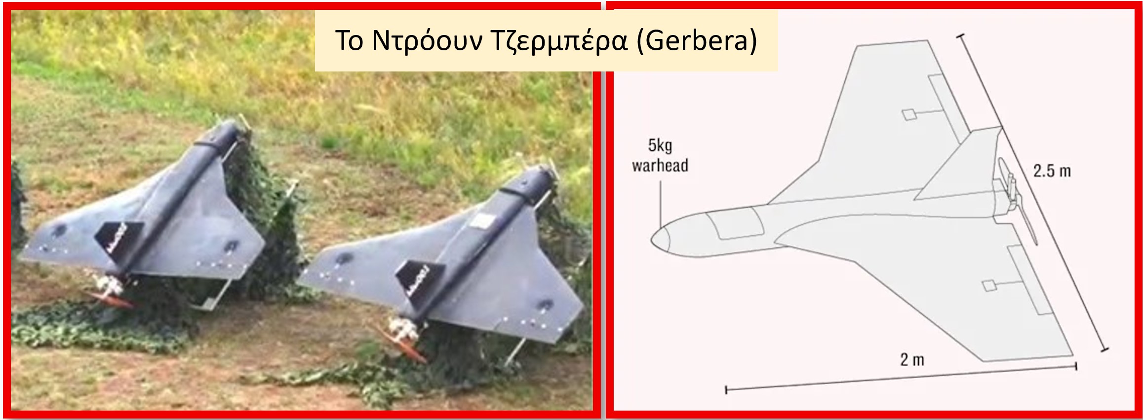 [1] Το ρωσικό ντρόουν Τζερμπέρα (drone Gerbera) εντάσσεται στη κατηγορία των «περιφερόμενων πυρομαχικών (loitering munition)». Είναι μικρό (2 μέτρα μήκος, 2,5 μ. πλάτος), έχει εμβέλεια 600 χλμ και το κόστος ανέρχεται σε 10.000 δολ.). Η ταχύτητα του είναι 160 Km/h (100mph), σε ύψος έως 3.000 μέτρα. Η Κινέζικη εταιρεία Sky Walker Technology's κατασκευάζει τα επί μέρους τμήματά του και στη συνέχεια συναρμολογείτε στη Ρωσία. Αποτελεί την φθηνή έκδοση του Ιρανικού Shahed 136, το οποίο οι Ρώσοι ονόμασαν Γεράνι-2.