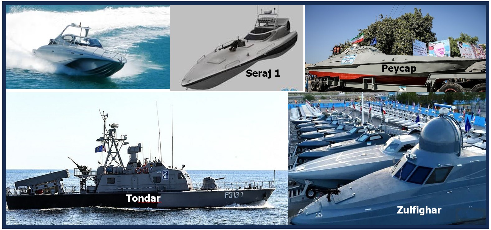 [5] Το Ναυτικό των Φρουρών της Επανάστασης (IRGCN) διαθέτει έναν μεγάλο στόλο ταχυπλόων (Fast Attack Craft - FAC), ο οποίος εκτιμάται από 3.000 έως 5.000 σκάφη. Η στρατηγική τους βασίζεται σε τακτικές «σμήνους» (swarming), χρησιμοποιώντας την ταχύτητα και τον μεγάλο αριθμό για να υπερκεράσουν μεγαλύτερα πολεμικά πλοία. Τα σκάφη αυτά είναι εξοπλισμένα με πυραύλους, τορπίλες, ρουκέτες και βαριά πολυβόλα. Οι Κυριότεροι Τύποι Ταχυπλόων είναι: