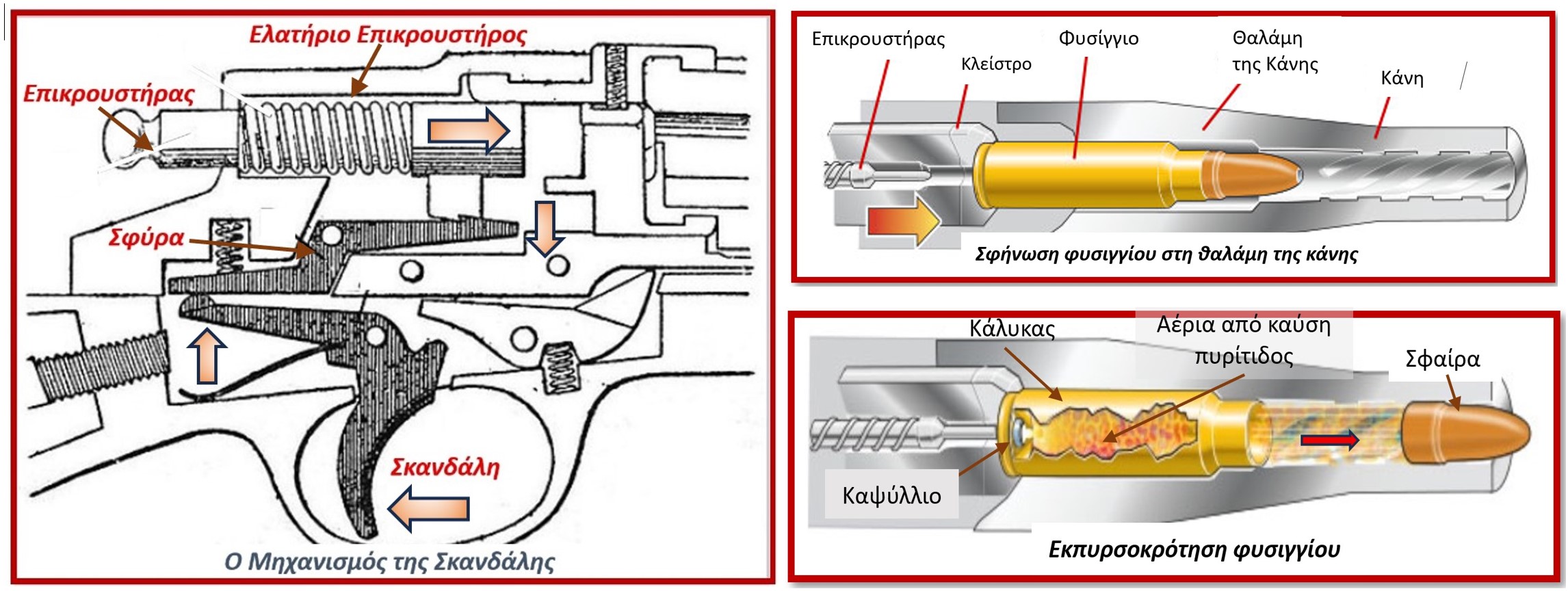 Η «μάχη» στα Βορίζια ανέδειξε την προτίμηση ικανού αριθμού Ελλήνων στα αυτόματα πολεμικά τυφέκια και ειδικά στο ρωσικής προελεύσεως ΑΚ 47[1], που κατασκεύασε ο Μιχαήλ Καλάσνικοφ[2]. Η εκπυρσοκρότηση των πυροβόλων όπλων επιτυγχάνεται δια της πιέσεως της σκανδάλης με τον δείκτη. Η κίνηση αυτή μέσω της σφύρας απελευθερώνει το ελατήριο του επικρουστήρος (μίας λεπτής και αιχμηρής μεταλλικής ράβδου), ο οποίος στη συνέχεια προσκρούει με δύναμη στο καψύλλιο του φυσιγγίου, το οποίο αναφλέγεται και μεταδίδει την φλόγα στην πυρίτιδα εντός του κάλυκος. Τα παραγόμενα αέρια ωθούν την σφαίρα εντός της κάνης, η οποία εξέρχεται με ταχύτητα 2.500 χλμ/ώρα, προκαλώντας το θάνατο, ή τον τραυματισμό των ατόμων που παρεμβάλλονται στην τροχιά της (δραστικό/μέγιστο βεληνεκές: 400/900 μέτρα).