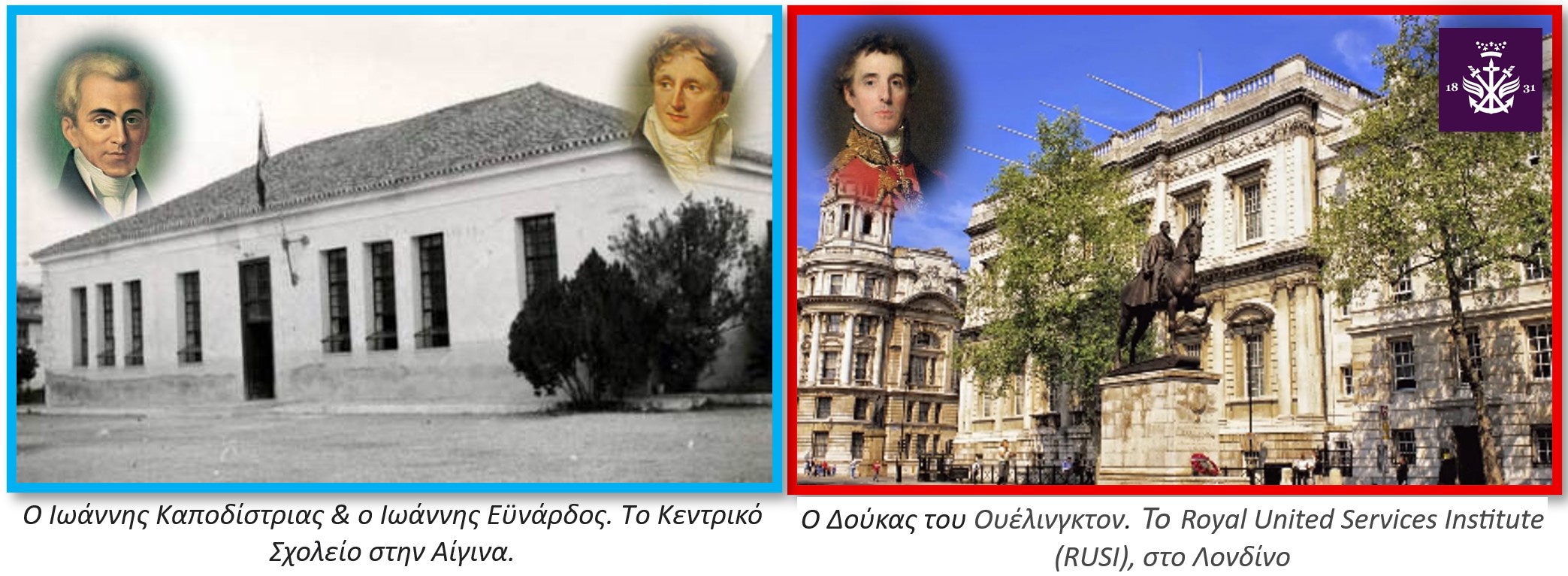 Την 3η Φεβρουαρίου 1830, η Ελλάδα αναγνωρίσθηκε ως ανεξάρτητο κράτος[8]. Το 1831 στο Λονδίνο ο Πρώτος Δούκας του Ουέλινγκτον[9] (1769-1852) εγκαινίασε το Βασιλικό Ινστιτούτο Ηνωμένων Υπηρεσιών για Μελέτες Αμύνης και Ασφαλείας, το οποίο σήμερα φέρει την ονομασία «Βασιλικό Ινστιτούτο Ηνωμένων Υπηρεσιών [Royal United Services Institute (RUSI)]. Το RUSI θεωρείται η παλαιότερη δεξαμενή σκέψεως (Think Tank) στον κόσμο για θέματα στρατηγικής. Το 1994, με διαφορά 163 χρόνων, ιδρύθηκε στη πατρίδα μας η Ελληνική Εταιρεία Στρατηγικών Μελετών (ΕΛ.Ε.Σ.ΜΕ)[10]. Την ίδια ακριβώς περίοδο ο Καποδίστριας με ελάχιστους πόρους και υπό χαώδεις συνθήκες, αγωνίζονταν να λειτουργήσει τα πρώτα αλληλοδιδακτικά σχολεία (δημοτικά και γυμνάσια). Το 1831, με χρηματοδότηση από τον Ελβετό Ιωάννη Εϋνάρδο[11], o πρώτος κυβερνήτης ίδρυσε το «Κεντρικό Σχολείο ή Εϋνάρδειο Διδασκαλείο» για την εκπαίδευση των δασκάλων. Όταν εμείς προσπαθούσαμε να μάθουμε ανάγνωση και γραφή στο Ηνωμένο Βασίλειο εντρυφούσαν σε θέματα γεωστρατηγικής. Τα ευρωπαϊκά κράτη μετρούσαν αιώνες λειτουργίας και εμείς έπρεπε να «τρέξουμε» εάν επιθυμούσαμε να τους προλάβουμε. Στο πέρασμα των αιώνων η κατάσταση είχε αντιστραφεί. Όταν τους 5ο και το 4ο αιώνα π.Χ. ανεγείραμε τον Παρθενώνα και ο Πλάτων[12] (427-347 π.Χ.) ίδρυσε την Ακαδημία του, οι ευρωπαίοι ζούσαν εντός σπηλαίων και τρεφόντουσαν με ωμά κρέατα.