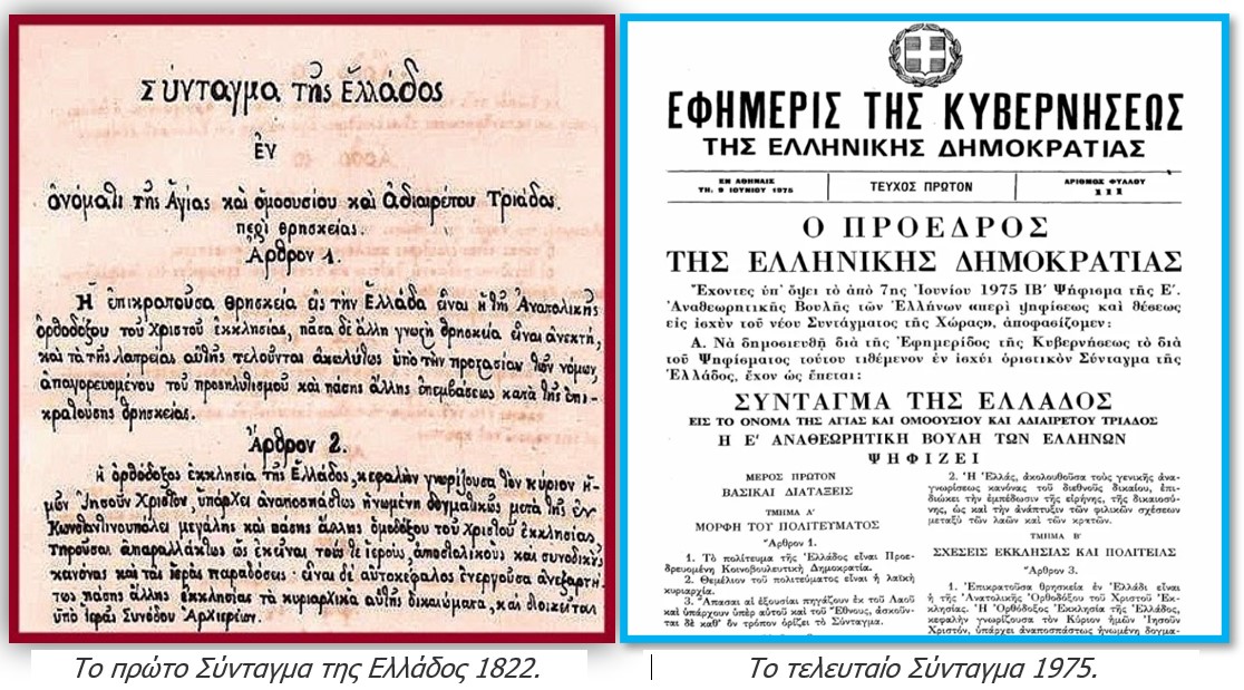 [14] Κατά τη διάρκεια της Ελληνικής Επαναστάσεως ψηφίστηκαν 2 συντάγματα: Το 1822, το Σύνταγμα της Επιδαύρου και το 1824, το Σύνταγμα του Άστρους, «Προσωρινό Πολίτευμα της Ελλάδος», με τα οποία τέθηκαν οι βάσεις της πολιτικής οργανώσεως του νεοσύστατου κράτους. Από την απελευθέρωση μέχρι σήμερα ψηφίστηκαν 9 συντάγματα: Το 1844, το 1864, το 1911, το 1927, το 1935, το 1952, το 1968, το 1973 και τέλος το 1975 στο οποίο έγιναν 4 αναθεωρήσεις (1986, 2001, 2008, 2019).