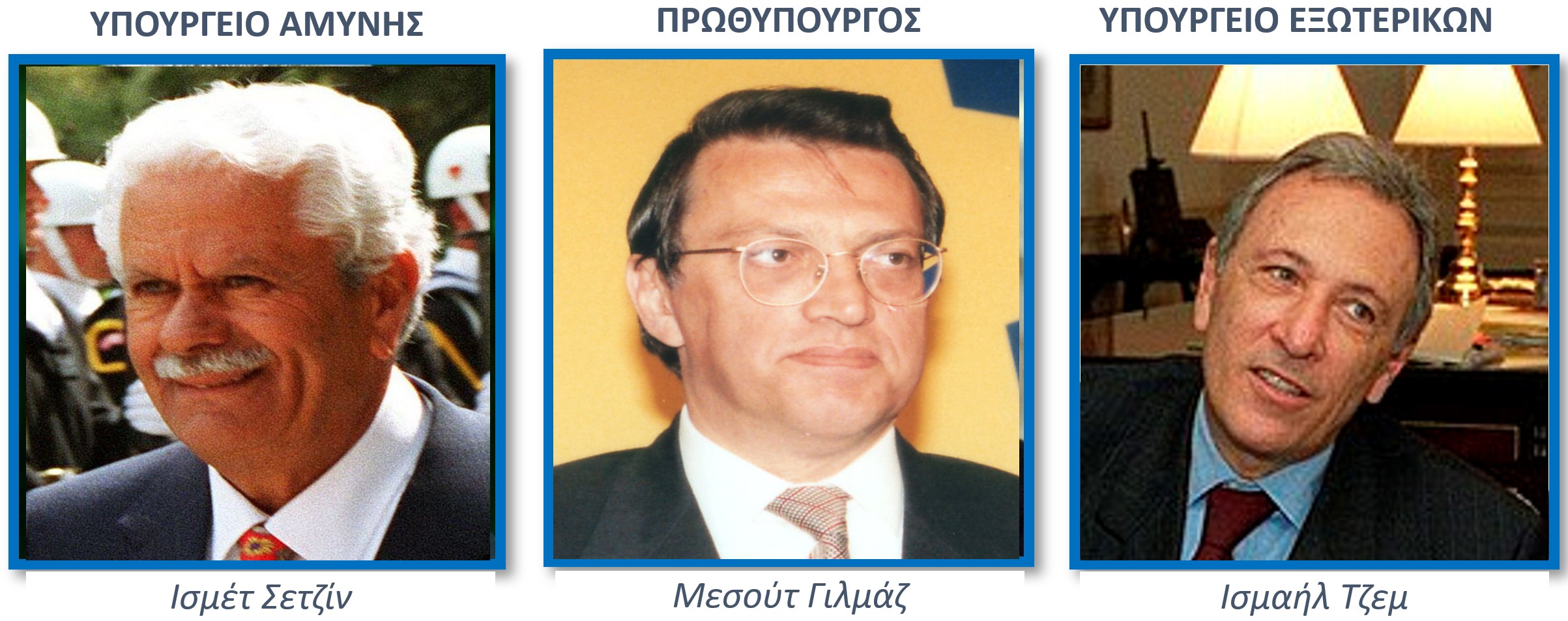 [12] O Ισμαήλ Τζεμ, (1940 Κωνσταντινούπολη-2007), σπούδασε στο Ινστιτούτο Πολιτικών Σπουδών του Παρισιού. Διετέλεσε Υπουργός Εξωτερικών από το 1997 έως το 2001. Μαζί με τον Έλληνα ομόλογό του Γεώργιο Παπανδρέου απετέλεσαν τους πρωταγωνιστές στην υλοποίηση της λεγόμενης τότε «προσέγγισης των δύο χωρών» (Ελλάδας-Τουρκίας), με αφορμή τους καταστροφικούς σεισμούς που δοκίμασαν οι δύο χώρες.