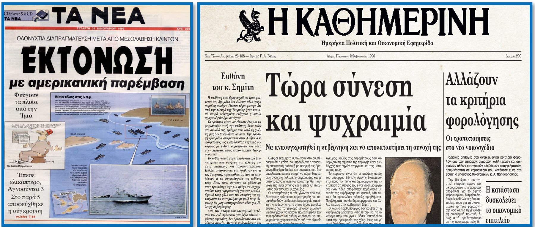 Τις πρώτες πρωινές ώρες της 31ης Ιανουαρίου 1996, η Ελλάδα βρέθηκε στα πρόθυρα πολεμικής αναμετρήσεως με την Τουρκία. Η κρίση κορυφώθηκε την 01:40, μετά την αποβίβαση Τούρκων καταδρομέων στην Μικρονησίδα της Δυτικής Ίμιας ή Λιμνιάς εκτάσεως 26 στρεμμάτων, 10 χιλιόμετρα ανατολικά της Καλύμνου, επί της οποίας δεν υπήρχαν Ελληνικές δυνάμεις. Ο Πρωθυπουργός Κώστας Σημίτης[1] (1936-2025), ενημερώθηκε την 03:30 για την Τουρκική ενέργεια, ενώ προέδρευε του Κυβερνητικού Συμβουλίου Εξωτερικών και Αμύνης (ΚΥΣΕΑ) [2], στο γραφείο του στη Βουλή. O Θεόδωρος Πάγκαλος[3] (1938-2023) ήταν Υπουργός Εξωτερικών, ο Γεράσιμος Αρσένης[4] (1931-2016) Υπουργός Εθνικής Αμύνης και ο Ναύαρχος Χρήστος Λυμπέρης (1935) Αρχηγός ΓΕΕΘΑ (Γενικό Επιτελείο Εθνικής Αμύνης). Στην Τουρκία η Τανσού Τσιλέρ[5] [Tansu Ciller (1946)] ήταν Πρωθυπουργός, ο Ντενίζ Μπαϊκάλ [Deniz Baykal (1938-2023)] Υπουργός Εξωτερικών, ο Βέφα Τανίρ [Vefa Tanir (1927-2023)] Υπουργός Εθνικής Αμύνης και ο Στρατηγός Ισμαήλ Καρανταγί [İsmail Karadayı (1932-2020)] Αρχηγός ΓΕΕΘΑ.