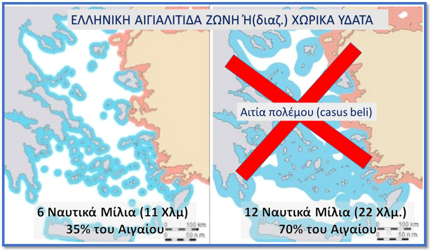 Την 1η Ιουνίου 1995, η Βουλή των Ελλήνων ψήφισε τη Διεθνή Σύμβαση του ΟΗΕ για το Δίκαιο της Θαλάσσης [UNCLOS (United Nations Convention of the Law of the Sea)]. [6] Η ενέργεια αυτή μας έδινε το δικαίωμα επεκτάσεως των χωρικών υδάτων μας σε 12 ναυτικά μίλια (νμ), ή 22,2 χιλιόμετρα (χλμ). Η πατρίδα μας στο Αιγαίο έχει χωρικά ύδατα εύρους 6 νμ (11,1 χλμ.), ενώ στο Ιόνιο Πέλαγος 12 νμ από το 2021. Η Τουρκία δεν έχει υπογράψει την UNCLOS, αλλά στην Μαύρη Θάλασσα και στις ακτές στη Μεσόγειο Θάλασσα έχει χωρικά ύδατα πλάτους 12 νμ, ενώ κατά μήκος των θαλασσίων συνόρων της με την Ελλάδα 6 νμ. Η Ελλάς με χωρικά ύδατα 6 ναυτικών μιλίων κατέχει το 35%, του θαλασσίου χώρου του Αιγαίου Πελάγους, ενώ η Τουρκία το 7%. Εάν τα επεκτείνουμε σε 12 ναυτικά μίλια, θα καρπωθούμε το 70% του Αιγαίου.