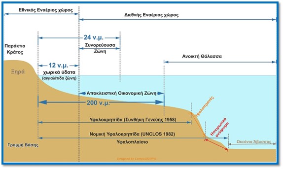 [8] Νόμο 2321/1995, Άρθρο 76 Ορισμός της Υφαλοκρηπίδας Η υφαλοκρηπίδα ενός παράκτιου Κράτους αποτελείται από το θαλάσσιο βυθό και το υπέδαφος του που εκτείνεται πέραν της χωρικής του θάλασσας καθ’ όλη την έκταση της φυσικής προέκτασης του χερσαίου του εδάφους μέχρι του εξωτερικού ορίου του υφαλοπλαισίου ή σε μια απόσταση 200 ναυτικών μιλίων από τις γραμμές βάσης από τις οποίες μετράτε το πλάτος της χωρικής θάλασσας, όπου το εξωτερικό όριο του υφαλοπλαισίου δεν εκτείνεται μέχρι αυτή την απόσταση.