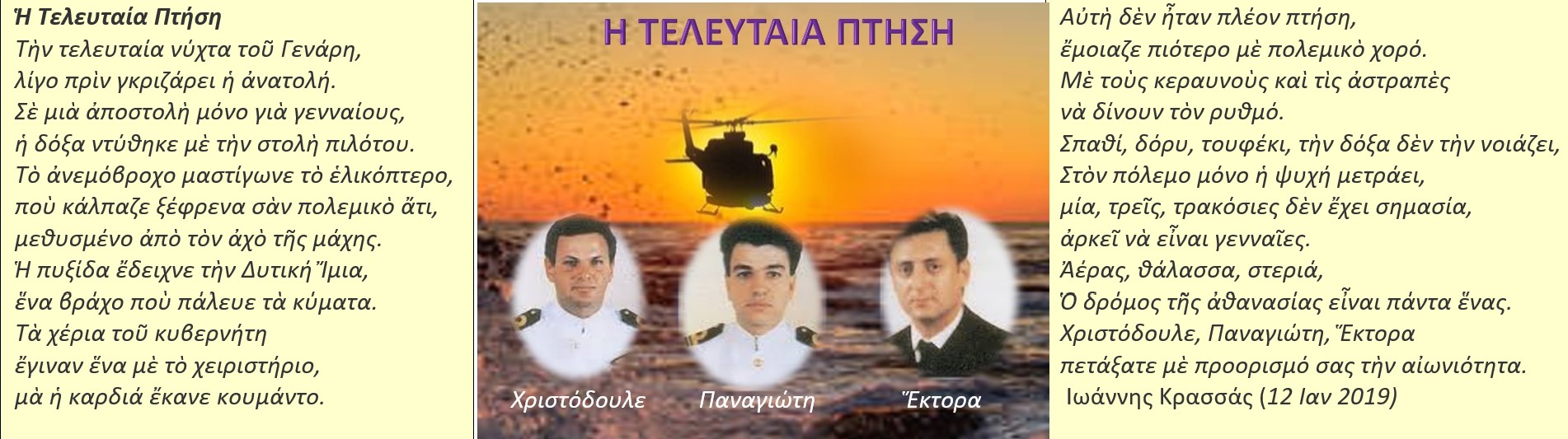 Τὸ ἄρθρο εἶναι ἀφιερωμένο στὴν μνήμη τοῦ Ὑποπλοιάρχου Χριστοδούλου Καραθανάση, 35 χρονῶν, ἀπὸ τὸν Παπάγο, τοῦ Ὑποπλοιάρχου Παναγιώτη Βλαχάκου, 32 χρ ἀπὸ τὴν Λάγια τῆς Μάνης καὶ τοῦ Ἀρχικελευστοῦ Ἕκτορος Γιαλοψοῦ, 30 χρ ἀπὸ τὸν Ἀφιώνα της Κέρκυρας, οἱ ὁποῖοι ἔπεσαν ἡρωικῶς κατὰ τὴν ἐκτέλεση τοῦ καθήκοντος τὴν 05:01 τῆς 31ης Ἰανουαρίου 1996 στὴν περιοχή των Ἰμίων.