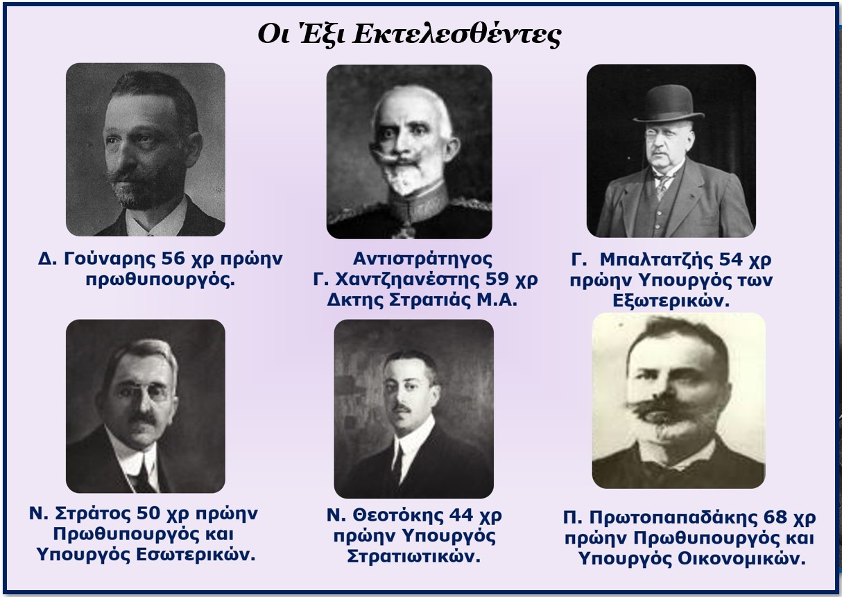 - Την 14 Νοεμβρίου 1922, η Εκτέλεση των Έξι (5 πολιτικών και ενός στρατιωτικού) ως υπευθύνων της Μικρασιατικής Καταστροφής. Βλέπε σχετικό άρθρο, Η Εκτέλεση των Έξι (15 Νοε 1922).