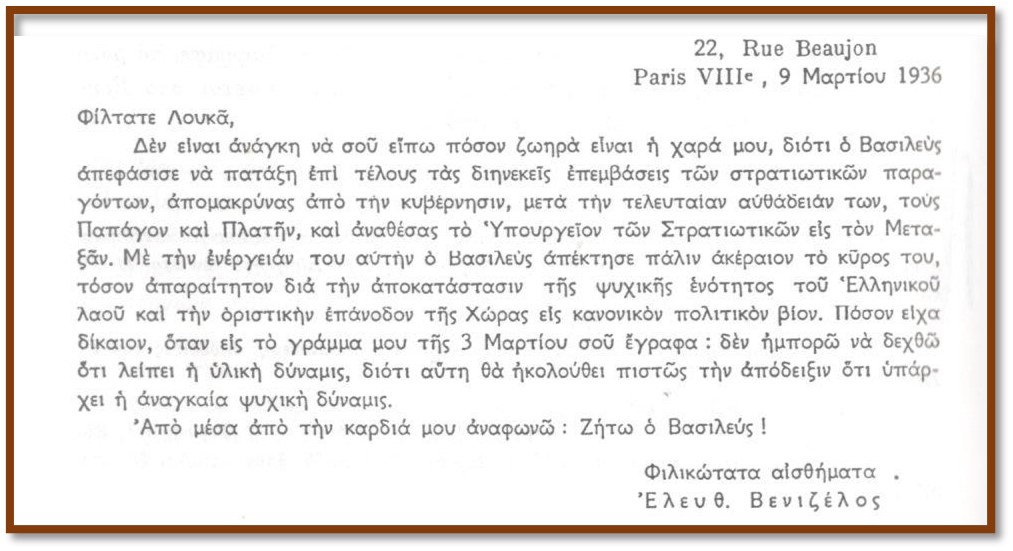 Την 9η Μαρτίου 1936 μετά την επάνοδο του Γεωργίου Β΄ στο θρόνο, ο Βενιζέλος διαμένων στο Παρίσι, έστειλε επιστολή προς τον Βουλευτή Αχαΐας Λουκά Ρούφο[17] (1878-1949) στην οποία έγραφε: «Δὲν εἶναι ἀνάγκη νὰ σοῦ εἴπω πόσο ζωηρὰ εἶναι ἡ χαρά μου, διότι ὁ Βασιλεὺς ἀπεφάσισε νὰ πατάξη ἐπιτελοῦς τὰς διηνεκεῖς ἐπεμβάσεις τῶν στρατιωτικῶν παραγόντων …» και κλίνει την επιστολή με τη πρόταση: «’Από μέσα άπό τήν καρδιά μου ἀναφωνῶ: Ζήτω ὁ Βασιλεύς».[18]