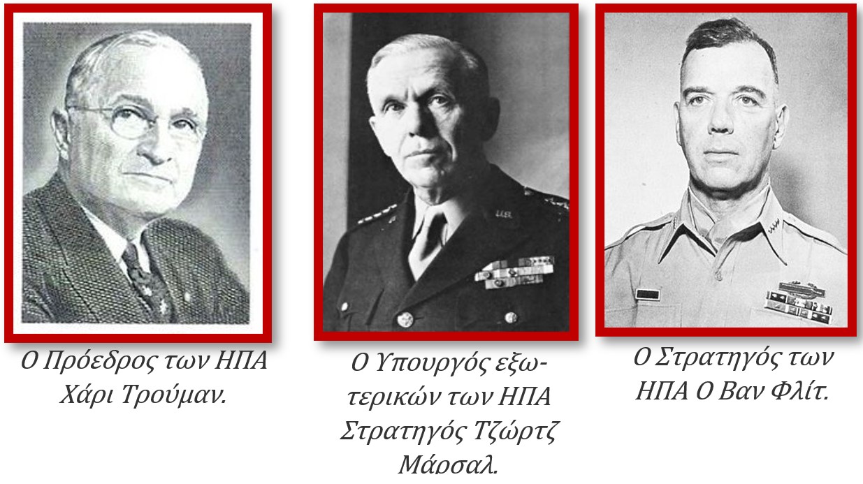 [5] Το «Δόγμα Τρούμαν» έθεσε το πολιτικό και ιδεολογικό πλαίσιο του ψυχρού πολέμου. Μετατόπισε την αμερικανική εξωτερική πολιτική προς την Σοβιετική Ένωση, από την πολιτική του «κατευνασμού», στην πολιτική της «ανασχέσεως». Το άγαλμα του Τρούμαν τοποθετήθηκε στη γωνία των οδών Βασιλέως Κωνσταντίνου και Βασιλέως Γεωργίου το 1963, προσφορά της οργανώσεως ΑΧΕΠΑ, των Ελλήνων της Αμερικής και έχει γκρεμιστεί τρεις φορές μέχρι σήμερα. Το ίδιο συνέβη με την προτομή του Στρατηγού Βαν Φλιτ στην Καστοριά, την οποία πέταξαν στην Λίμνη το 1999, αλλά επανατοποθετήθηκε σε ιδιωτικό χώρο το 2007. Οι ενέργειες αυτές μας ζημιώνουν ως κράτος.