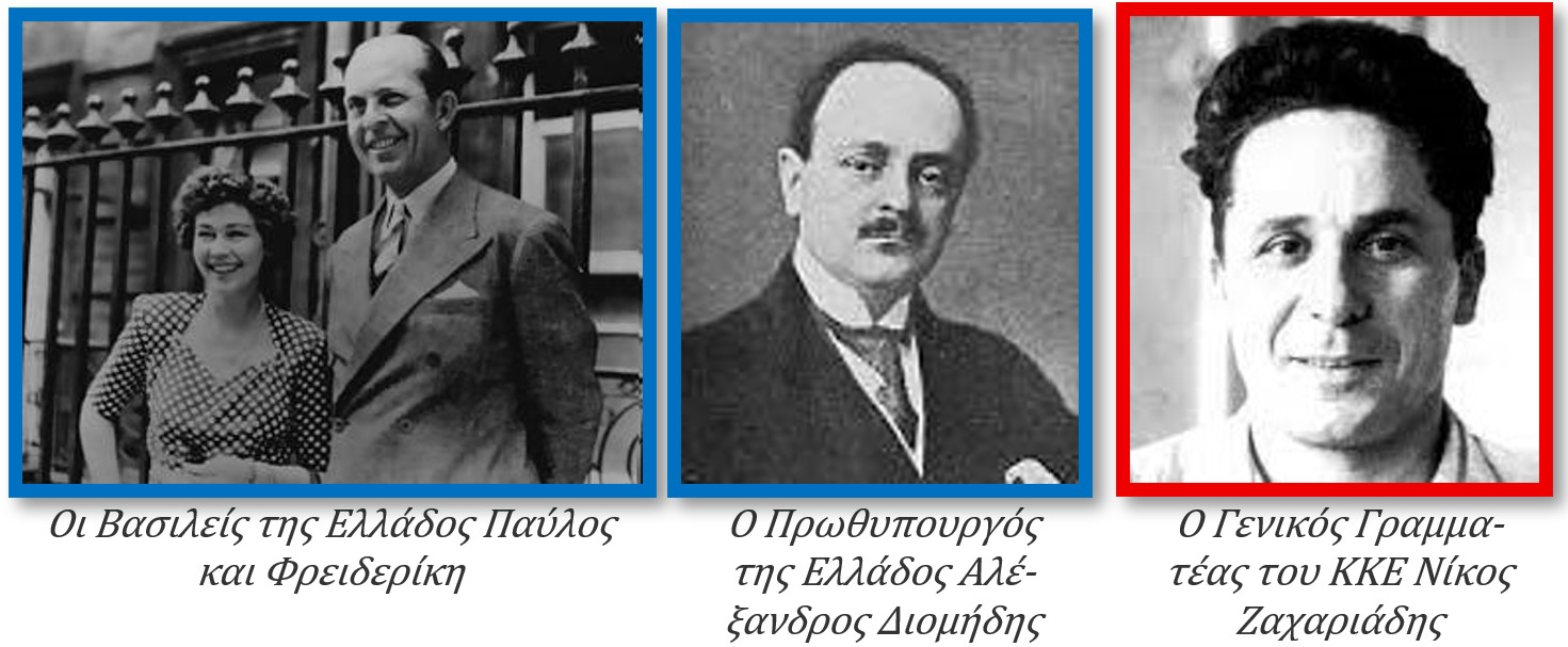 Βασιλεύς της Ελλάδος ήταν ο Παύλος Α΄, ενώ Πρωθυπουργός της κυβερνήσεως ήταν ο Αλέξανδρος Διομήδης[3]. Ο Ζαχαριάδης ήταν πρόεδρος της Προσωρινής Δημοκρατικής Κυβερνήσεως (ΠΔΚ)[4].
