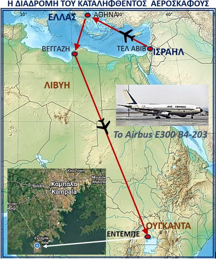 Την Κυριακή 27 Ιουνίου 1976, το επιβατικό αεροσκάφος της Air France[3] τύπου AIRBUS E300 B4-203[2], στα πλαίσια της πτήσεως AF 139, απογειώθηκε από το Τελ Αβίβ με προορισμό το Παρίσι με ενδιάμεση στάση στην Αθήνα. Στο αεροδρόμιο του «Ελληνικού» επιβιβάσθηκαν 2 Παλαιστίνιοι της οργανώσεως «Λαϊκό Μέτωπο για την Απελευθέρωση της Παλαιστίνης[4] [Popular Front for the Liberation of Palestine (PFLP)», 1 Γερμανός και μία Γερμανίδα της οργανώσεως «Επαναστατικοί Πυρήνες[5] (Revolutionäre Zellen)». Μετά την απογείωση, οι τρομοκράτες υπό την απειλή όπλων και χειροβομβίδων έγιναν κύριοι του αεροσκάφους. Σε πρώτο χρόνο υποχρέωσαν τον κυβερνήτη να προσγειωθεί στο αεροδρόμιο της Βεγγάζης της Λιβύης για ανεφοδιασμό. Εκεί απελευθέρωσαν μία νεαρή επιβάτιδα, η οποία προσποιήθηκε ότι απέβαλε. Στη συνέχεια το αεροσκάφος κατέληξε στο αεροδρόμιο της πόλεως Eντέμπε πλησίον της Καμπάλα (πρωτεύουσα της Ουγκάντας[6]), όπου 3 επιπλέον Παλαιστίνιοι προστέθηκαν στη δύναμη των τρομοκρατών.