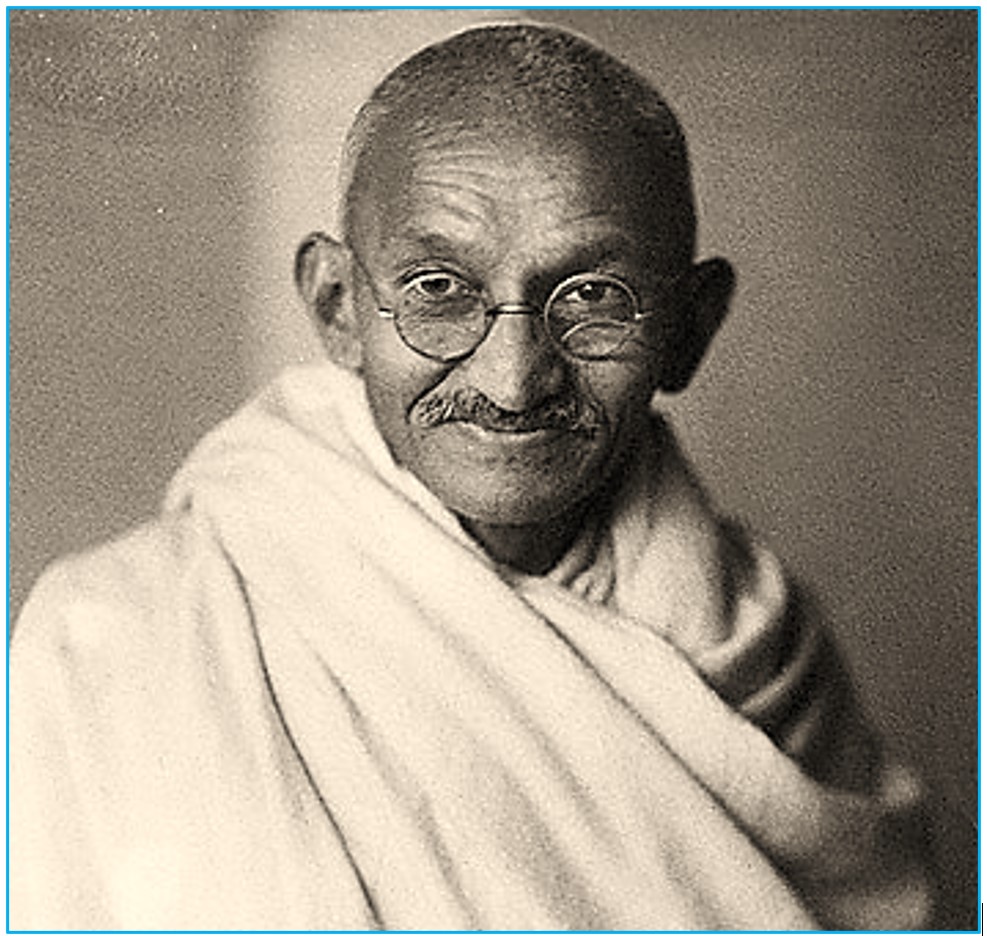 [8] Ο Μοχάντας Γκάντι (1869-1948), επίσης γνωστός ως Μαχάτμα Γκάντι, ήταν Ινδός δικηγόρος, στοχαστής και επαναστάτης ακτιβιστής. Υπήρξε σημαντικός πνευματικός οδηγός της Ινδίας και του κινήματος για την ανεξαρτησία της, καθώς και εμπνευστής της μεθόδου παθητικής αντιστάσεως χωρίς τη χρήση βίας έναντι των καταπιεστών. Η διδασκαλία του, σε συνδυασμό με τον ασκητικό του βίο, τον κατέστησαν παγκόσμιο σύμβολο της φιλοσοφικής και κοινωνικής διανοήσεως του 20ού αιώνος. Έγινε ευρύτερα γνωστός με την προσωνυμία Μαχάτμα, που σημαίνει «Μεγάλη Ψυχή». Τα γενέθλια του Γκάντι στις 2 Οκτωβρίου εορτάζονται παγκοσμίως ως η Παγκόσμια Ημέρα της μη Βίας.