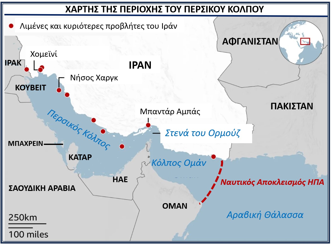 Την 28η Φεβρουαρίου 2026, οι ΗΠΑ και το Ισραήλ επιτέθηκαν εναντίον του Ιράν από θαλάσσης και αέρος. Έκτοτε η υφήλιος έχει επιδοθεί σε μία διαρκή παρακολούθηση της ναυσιπλοΐας δια μέσου των Στενών του Ορμούζ[3]. Η απαγόρευση διελεύσεως των πετρελαιοφόρων και των εμπορικών πλοίων έχουν δημιουργήσει σοβαρές ελλείψεις σε ενεργειακές και άλλες ύλες, με σοβαρές επιπτώσεις στις οικονομίες και τη καθημερινότητα των πολιτών των περισσοτέρων κρατών. Το βόρειο μέρος του Περσικού Κόλπου, των Στενών του Ορμούζ και του Κόλπου του Ομάν αποτελούν έδαφος του Ιράν. Οι βραχώδεις ακτές και τα υψηλά όρη διευκολύνουν τον αμυνόμενο και δυσχεραίνουν τον επιτιθέμενο. Οι Ιρανοί έχουν κατασκευάσει υπόγειες κατασκευές για την κάλυψη των πυραυλικών τους συστημάτων, όπως επίσης ασφαλείς χώρους ελλιμενισμού των ταχυπλόων σκαφών κατά μήκος των παραλίων και στις μικρονησίδες. Η ανατροπή αυτού του πλεονεκτήματος δεν μπορεί να επιτευχθεί μόνο με βομβαρδισμούς, αλλά απαιτείται επιπλέον κατάληψη του εδάφους. Οι ΗΠΑ επέλεξαν το ναυτικό αποκλεισμό του Κόλπου του Ομάν, ο οποίος όμως δεν δύναται να παραταθεί επ’ αόριστον.