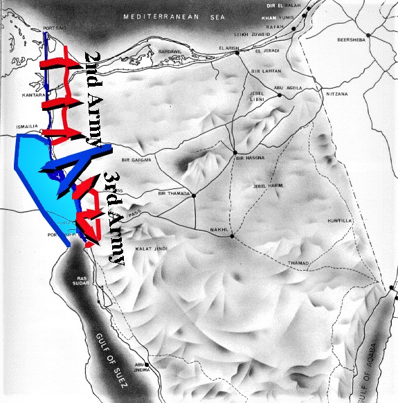 [10] Η Ισραηλινή αεροπορία είχε καταστρέψει τις πλωτές γέφυρες της 3ης Αιγυπτιακής Στρατιάς με αποτέλεσμα να μην μπορεί να επιστρέψει στην Δυτική Όχθη.