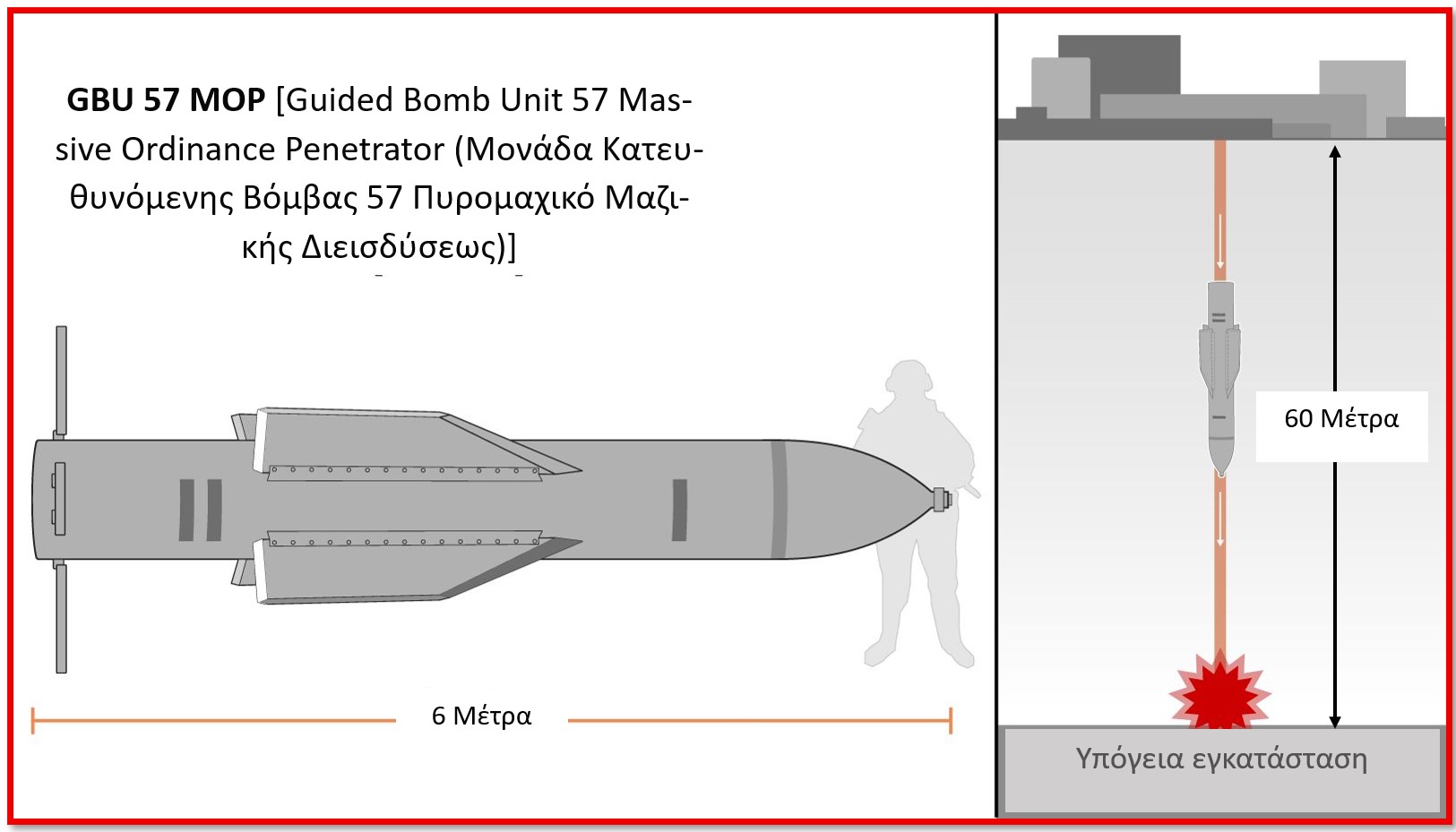 [8] Οι βόμβες της σειράς GBU 57 MOP [Guided Bomb Unit 57 Massive Ordinance Penetrator (Μονάδα Κατευθυνόμενης Βόμβας 57 Πυρομαχικό Μαζικής Διεισδύσεως)] παράγονται από την Αμερικανική εταιρεία Boeing και έχουν κατασκευαστεί για την καταστροφή υπογείων στόχων κατασκευασμένων με ενισχυμένο σκυρόδεμα. Το μήκος τους είναι 6,2 μέτρα και διαθέτουν ενσωματωμένο σύστημα δορυφορικής πλοηγήσεως. Είναι κατασκευασμένες από συμπαγές ατσάλι βάρους 11 τόνων, με ειδικού κράματος ενισχυμένο περίβλημα. Η εκρηκτική κεφαλή φέρει 2.423 κιλά εκρηκτικής ύλης αποτελούμενη από 2.082 κιλά AFX-57 (βελτιωμένος τύπος πλαστικού εκρηκτικού διπλάσιας ισχύος του ΤΝΤ) και 341 κιλά PXBN-114 (πολυμερές πλαστικό εκρηκτικό), Η βόμβα έχει διατρητική ικανότητα 60 μέτρων συμπαγούς εδάφους ή σκυροδέματος. Έχουν κατασκευασθεί μέχρι σήμερα τουλάχιστον 20 βόμβες με το κόστος μονάδος να ανέρχεται 13 εκατ. δολ./11,2 εκατ. ευρώ.