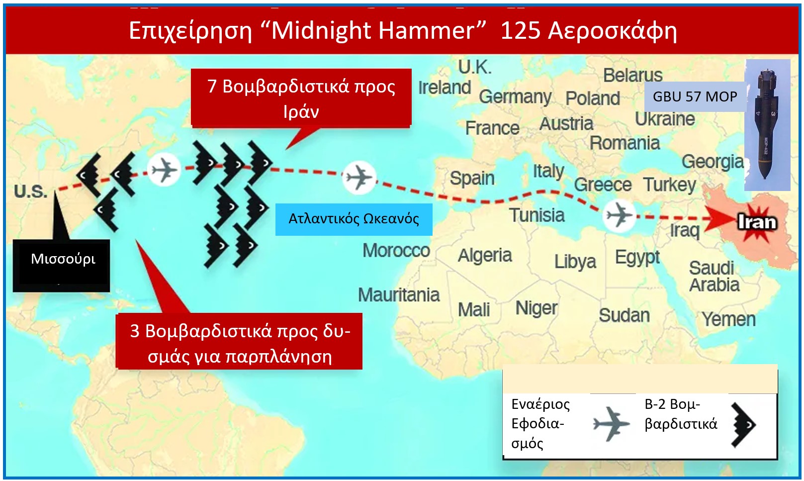 Την 21η Ιουνίου από τις 01:40 έως 02:00 (ώρα Ελλάδος), στα πλαίσια της επιχειρήσεως «Σφυρί του Μεσονυκτίου (Midnight Hammer)» οι ΗΠΑ βομβάρδισαν τις εγκαταστάσεις εμπλουτισμού ουρανίου του Ιράν στο Φορντό (Fordow) και στη Νατάνζ (Natanz) και στο Κέντρο Πυρηνικών Ερευνών στο Ισφαχάν (Isfahan). Στο Φορντό και τη Νατάνζ ρίφθηκαν 14 βόμβες GBU-57 MOP[8] από 7 βομβαρδιστικά αεροπλάνα Β2[9]. Το Ισφαχάν βομβαρδίσθηκε με 24 πυραύλους Κρουζ Tomahawk, οι οποίοι εκτοξεύθηκαν από το πυρηνοκίνητο υποβρύχιο Οχάϊο (Ohio), το οποίο έπλεε στην Αραβική Θάλασσα. Στην επιχείρηση συμμετείχαν συνολικά 125 αεροσκάφη διαφόρων τύπων.