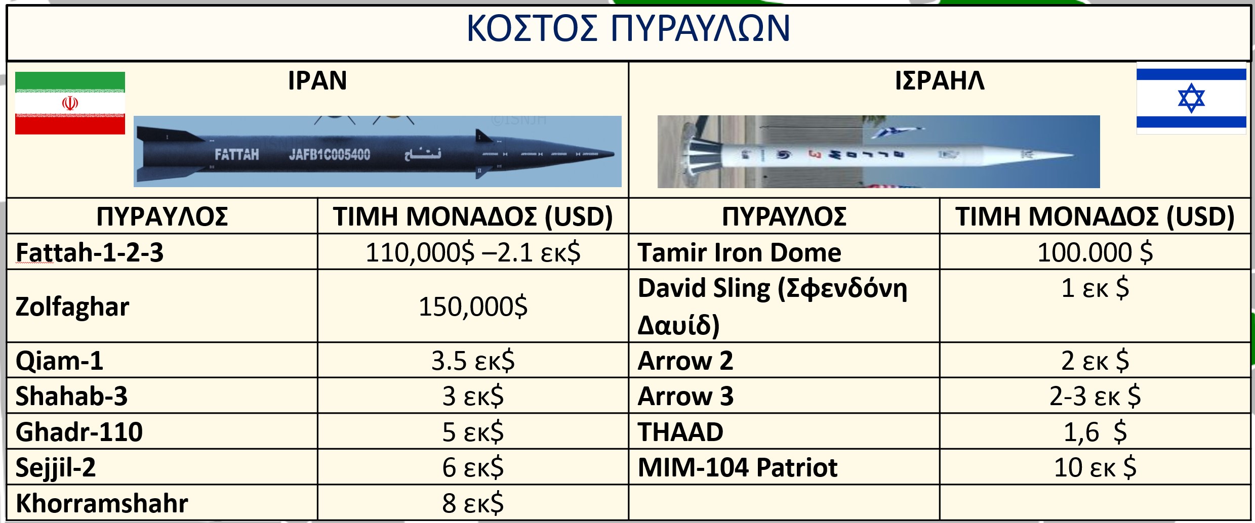 Στο πίνακα φαίνονται οι τιμές ανά μονάδα, των περισσότερο χρησιμοποιούμενων πυραύλων των δύο χωρών.