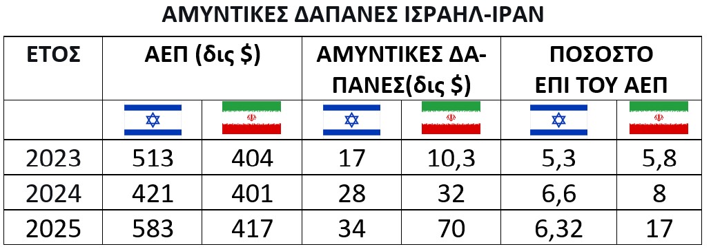 Για το Ισραήλ το κόστος του πολέμου ανήλθε σε 7,6 δισεκατομμύρια Ευρώ (633 εκ/ημέρα). Για το Ιράν δεν υπάρχουν ακριβή νούμερα. Οι αμυντικές δαπάνες των δύο κρατών ως ποσοστό του ΑΕΠ είναι όπως παρακάτω: